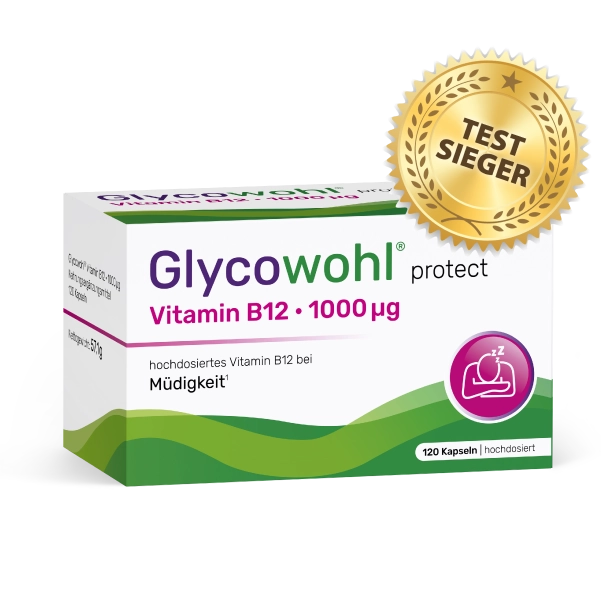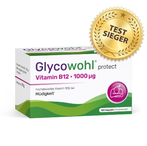 Glycowohl® protect Vitamin B12 · 1000 µg wurde von der bekannten Diabetes-Apothekenmarke Glycowohl® entwickelt und in Deutschland hergestellt. Das neue Nahrungsergänzungsmittel kombiniert die drei natürlichen bioaktiven Vitamin B12 Formen und überzeugt mit seiner hohen Dosis von 1000 µg. Der Fokus liegt auf Qualität und Reinheit der Inhaltstoffe, auf bedenkliche Zusatzstoffe wird verzichtet. Zudem punktet Glycowohl® protect Vitamin B12 · 1000 µg im Vergleich zum Wettbewerb mit einem hervorragenden Preis-Leistungs-Verhältnis.