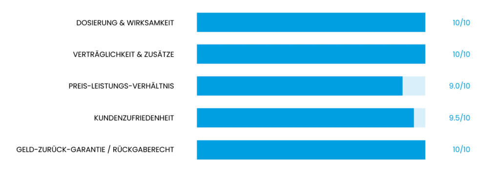 - Kundenzufriedenheit: Bewertungen von echten Menschen, die ein Präparat ausprobiert haben, sind wichtig. Diese geben ein unverfälschtes Bild von einem Produkt und liefern wertvolle Anhaltspunkte für Käuferinnen und Käufer. Das Team aus dem Testvergleich hat öffentlich verfügbare Kundenmeinungen zu den Testprodukten analysiert und ausgewertet. Das Ergebnis ist Teil der Gesamtbewertung.